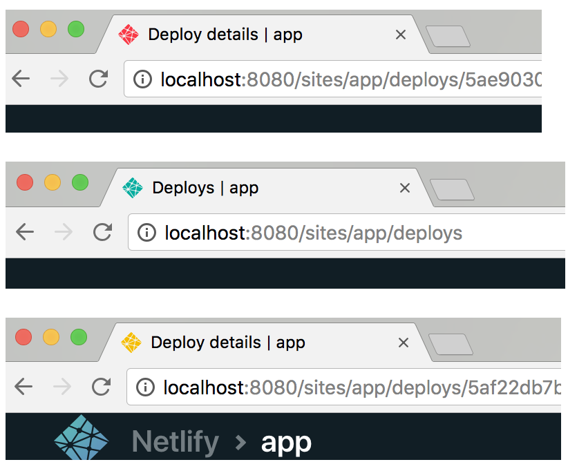 Ever tab away from a Netlify deploy log only to lose it next to a sea of similar looking Netlify tabs? Yeah, that happens to us, too. That’s why we recently rolled out an update that displays deploy status information in the favicon on your browser tab. The special favicons appear when you navigate to your deploy logs.