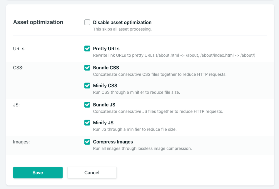 Available options like CSS and JS minification, image compression, and pretty URLs allow you to improve the performance of your sites with just a few clicks.