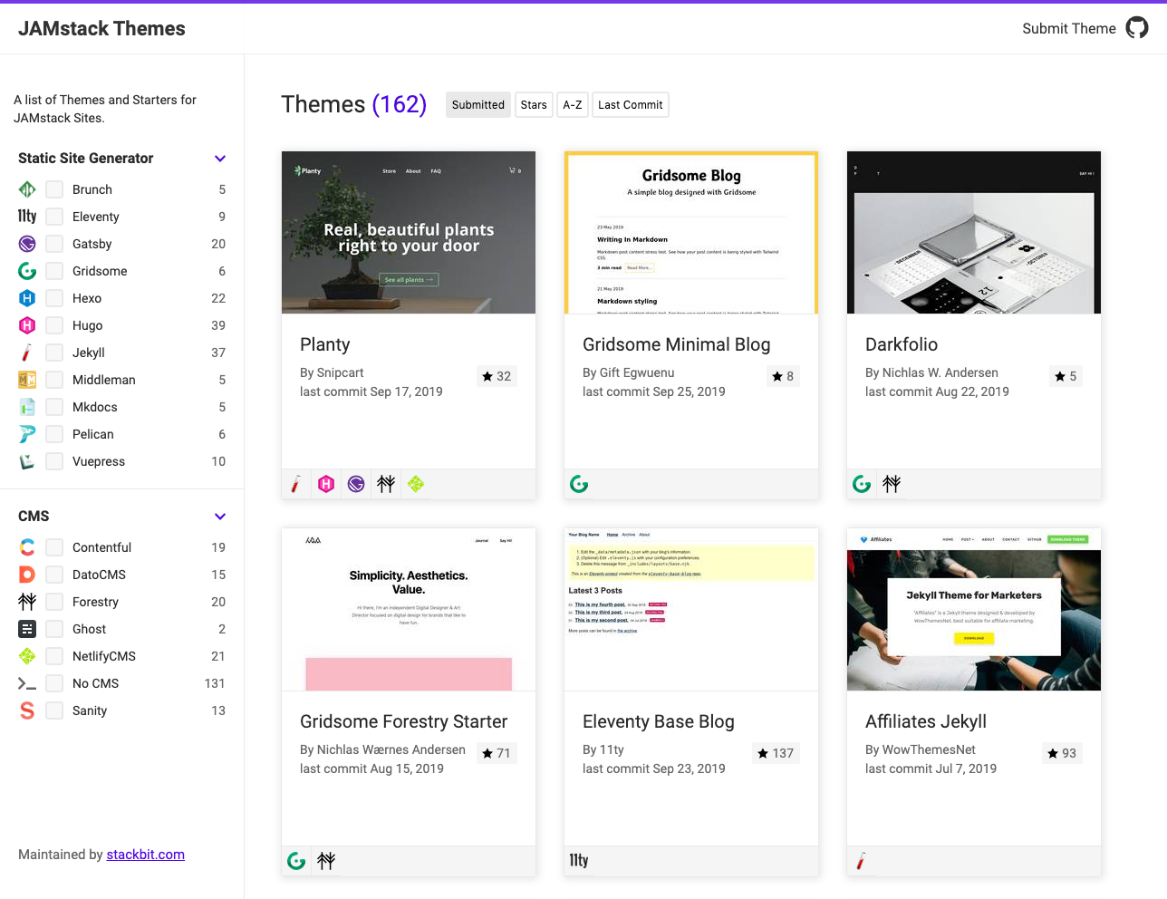 Got a theme you’d like to submit? Just make a PR https://github.com/stackbithq/jamstackthemes.e a PR https://github.com/stackbithq/jamstackthemes.