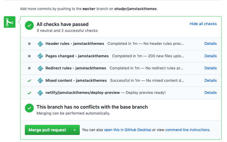 One of my favourite Netlify features is deploy previews. When a GitHub PR is submitted, Netlify automatically creates a deploy preview 🏜 I don’t know where it comes from, but it just appears… like magic. In the screenshot below, the last check contains the live deploy preview.
