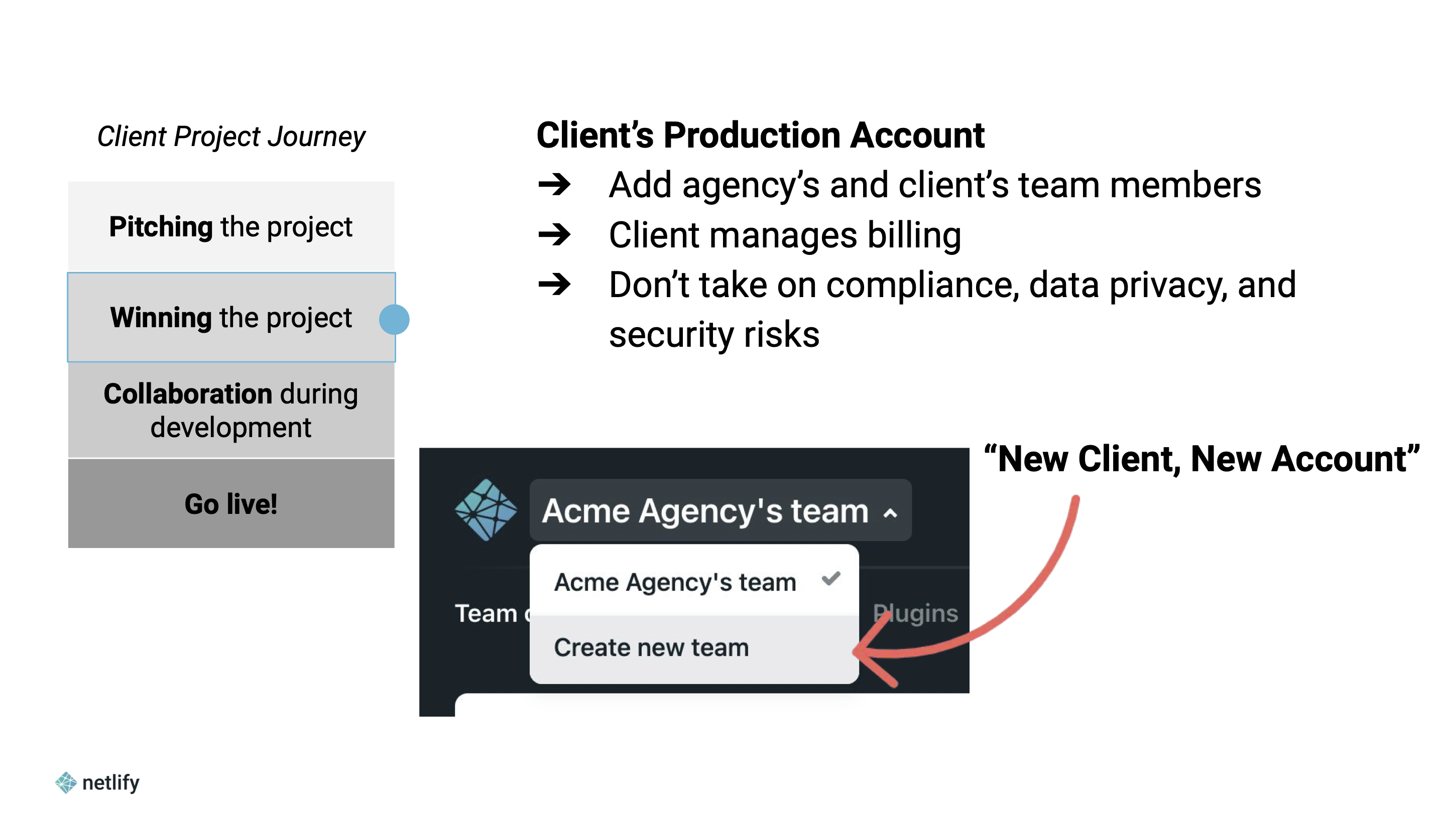 - Your agency creates and manages a Netlify account for the client