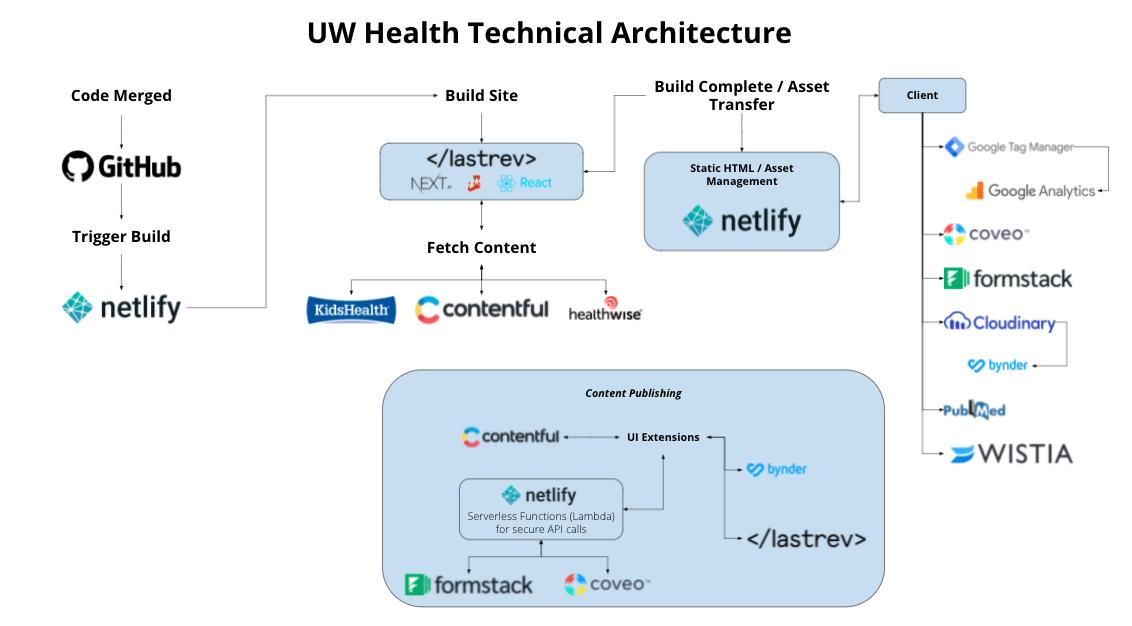 While the site is primarily static assets, Netlify serverless functions enhance the site with dynamic capabilities. UW Health fetches live data from lots of third-party sources, like Contentful, Coveo, and PubMed.