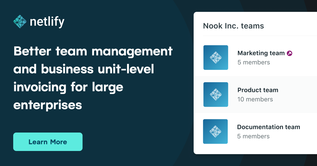 \ Netlify is making it easier to manage teams and monitor usage across different teams in your organization. The new Enterprise Grid plan includes advanced organization management capabilities designed for enterprises with multiple web development teams, providing team-level governance for projects that require the highest level of control and security.