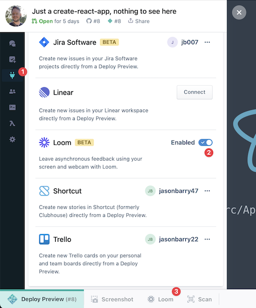 Even better, Deploy Previews include handy integrations with your favorite project management tools. Everything you need is right in the Deploy Preview, so your team can stay focused on providing quality feedback. You can record a video, write your comments, and save to tools like GitHub, GitLab, Linear, and Jira all without leaving your Deploy Preview tab.