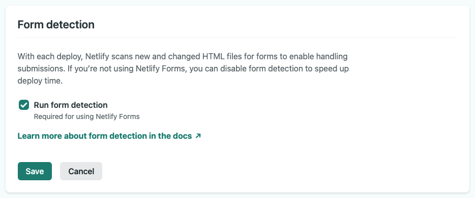 We looked at Netlify Forms earlier this month. You can read about how they work in this post. But if you’re not using Netlify Forms on your site, you might want to disable form detection to speed up your deploys. By default, Netlify’s build bots scan new and updated HTML files to automatically handle forms.