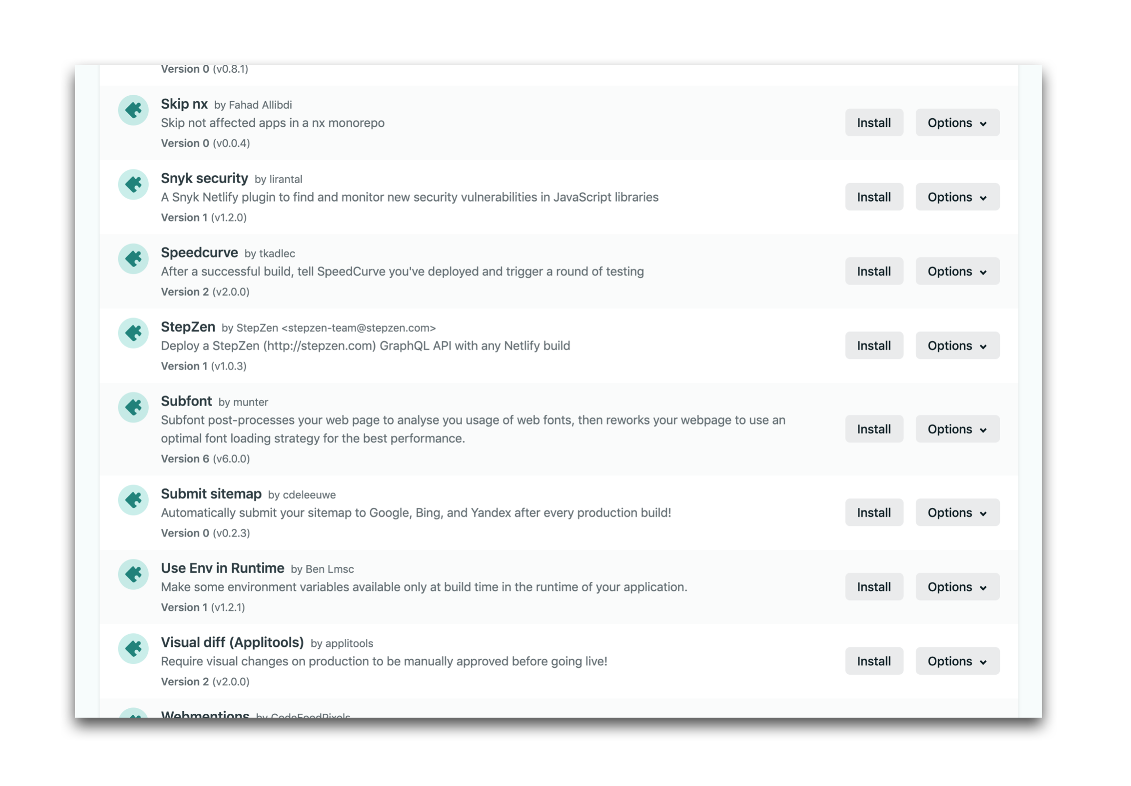 Build plugins are little utilities that you can install through your project dashboard that help with caching, optimizations, security, and a ton more. So when you run your build it can run your tests while you run to get lunch. Yay, more things at once! You can check out the whole list in the plugins dashboard.