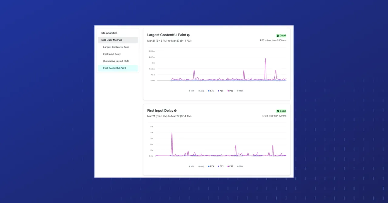 View real user metrics to monitor how your websites perform across multiple device types and percentiles based on actual visitor interactions, directly within the Netlify app.