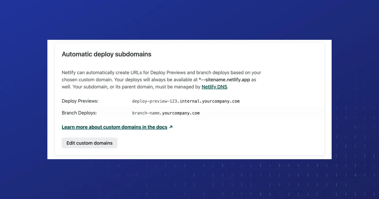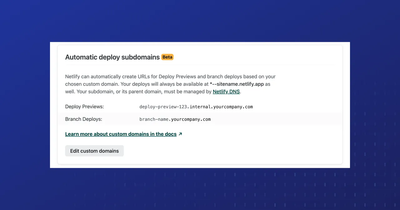 Set a custom domain for Deploy Previews and/or branch deploys, and Netlify will automatically create context-based subdomains for you! Automatic deploy subdomains help you increase brand safety and security for pre-production changes.