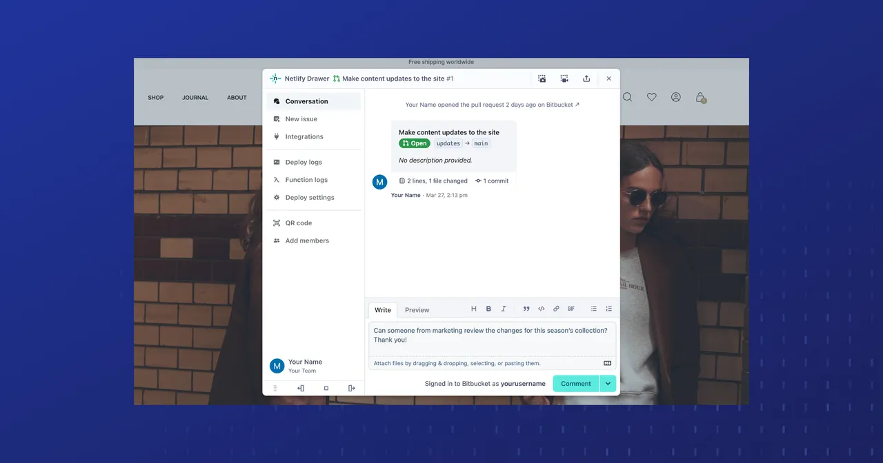 Sites on Netlify with Bitbucket repositories can now use Deploy Previews, collaboration tools in the Netlify Drawer, and deploy notifications.