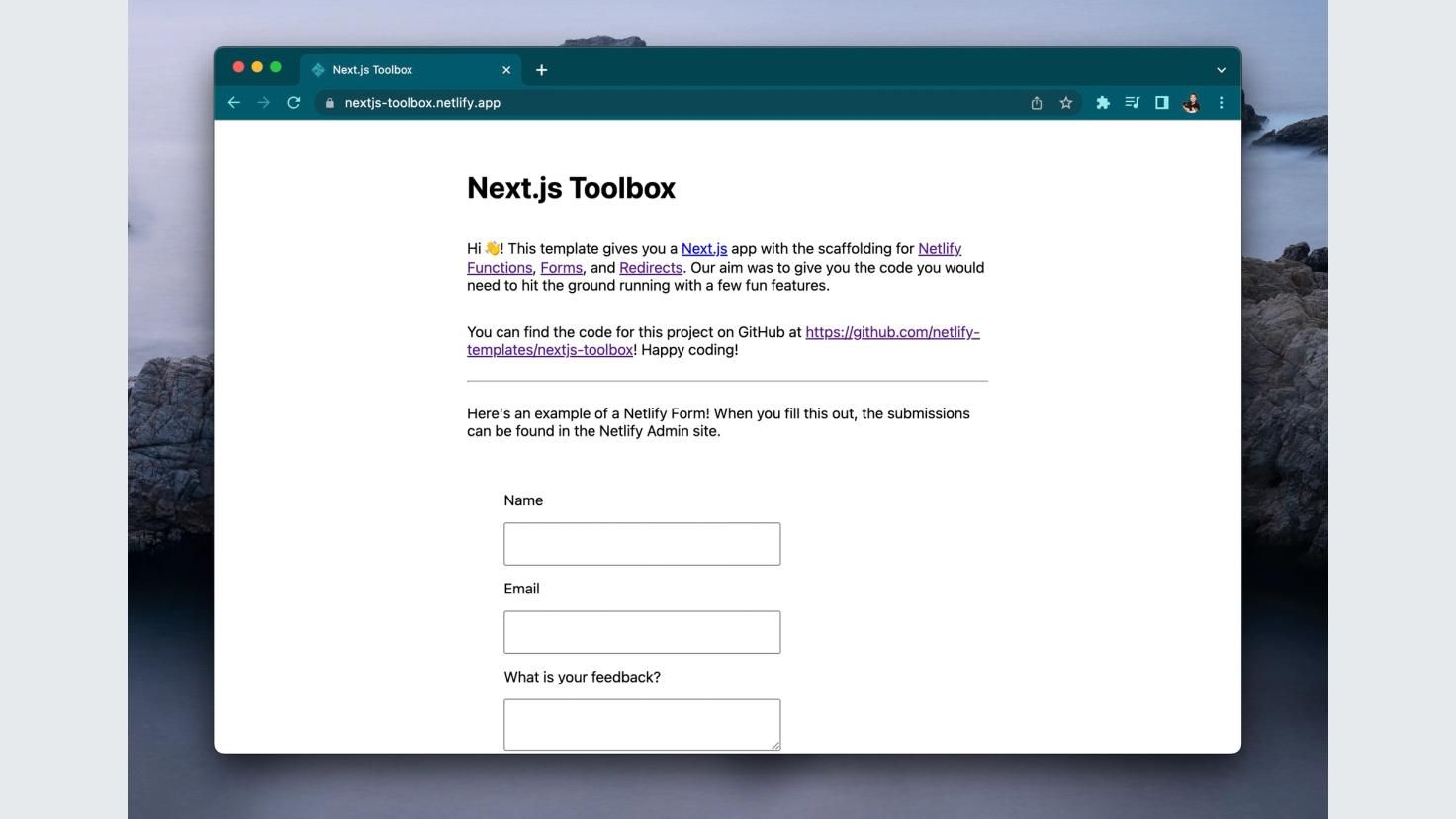 This NextJS v14 Toolbox template integrates commonly used Netlify features (Functions, Forms, and Redirects).