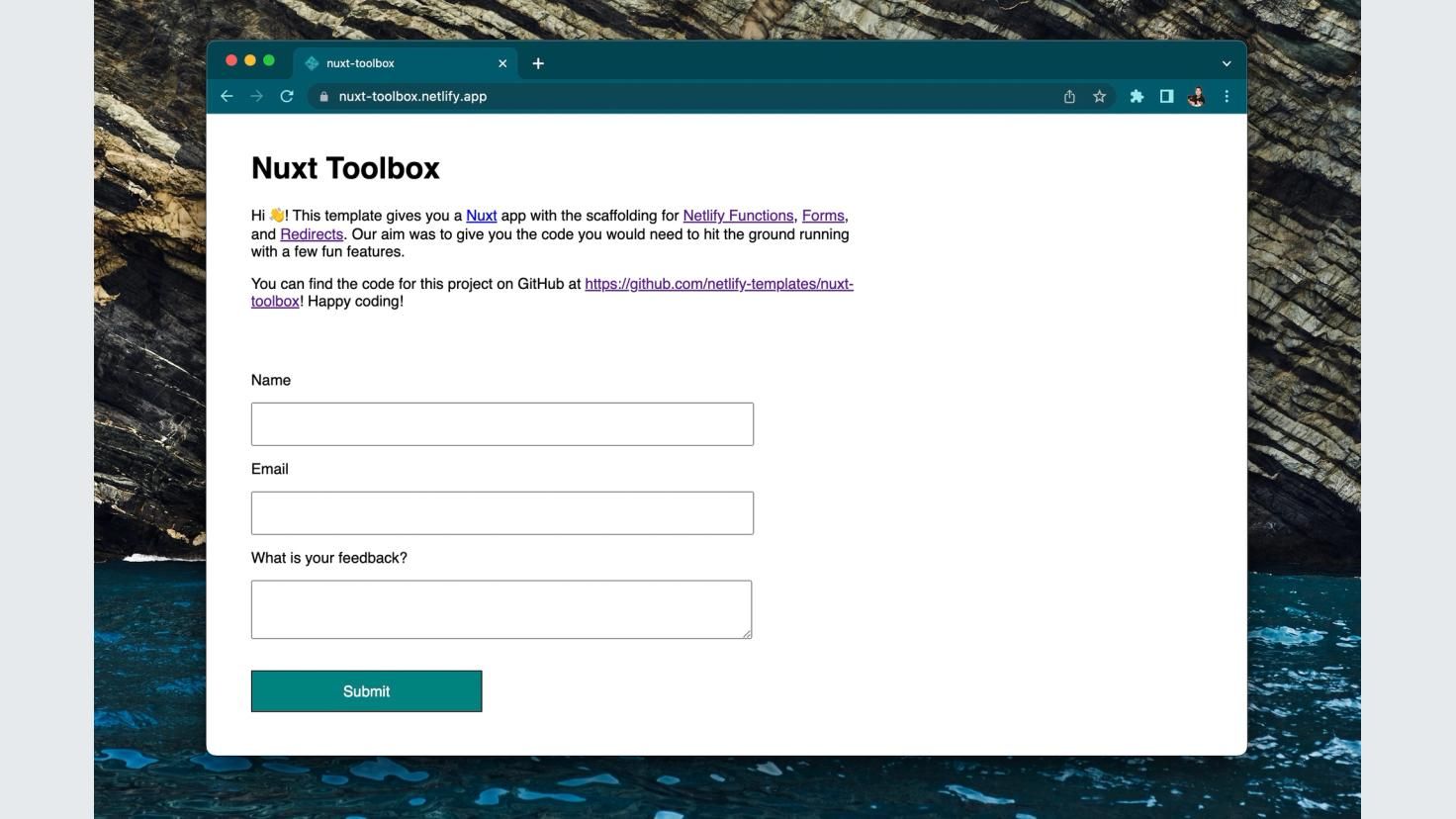 This NuxtJS v2 Toolbox template integrates commonly used Netlify features (Functions, Forms, and Redirects).